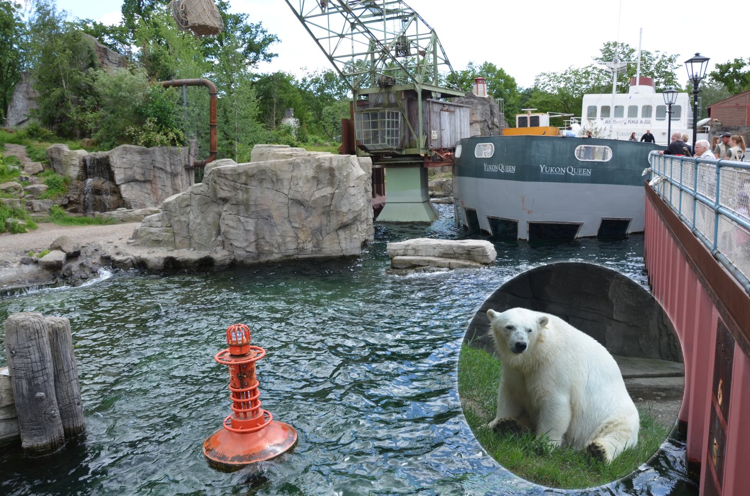 Die Eisbären und Pinguine leben in einem nachgebildeten Eismeerhafen samt Schiff, einer Forschungsstation und Holzhüttenambiente, welches sich Yukon Bay nennt.